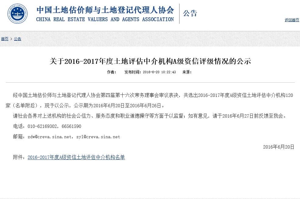 日前,中國土地估價師與土地登記代理人協(xié)會共選出2016-2017年度A級資信土地評估中介機(jī)構(gòu),我單位入選,至此,我單位已連續(xù)九年獲得“A級資信土地評估中介機(jī)構(gòu)”榮譽(yù)稱號。
